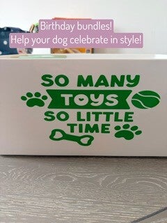 Every dog deserves a birthday bundle! The box can be personalised and used as a toy box, inside the box will be 3 toys, a birthday biscuit cake, birthday treats and a chew bundle. B
